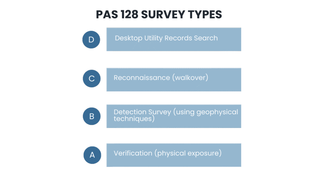 PAS 128 defines four survey types, each offering a different level of certainty depending on project stage and risk.
